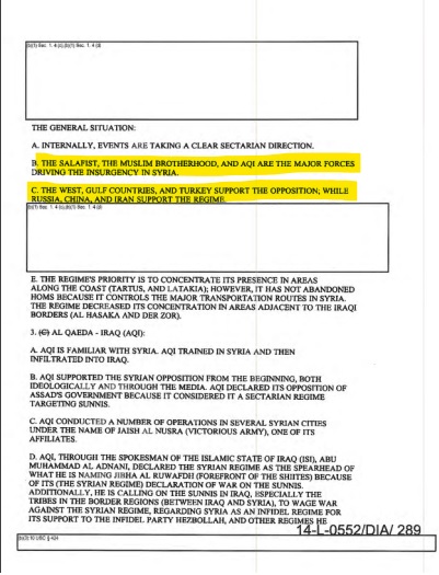 2012 tarihli sızdılıran ABD Savunma Bakanlığı bilgilendirme raporunda da ABD’nin Suriye iç savaşında isyanın en temel unsurlarını “ Selefiler, Müslüman Kardeşler ve El-Kaide” olarak tanımladığını “Rusya, Çin ve İran rejimi desteklerken, Batı, Körfez ülkeleri ve Türkiye’nin de muhalifleri desteklediği” ifadelerine rastlıyoruz. Ve yine aynı tarihte ABD Ulusal Güvenlik Danışmanı Jake Sullivan’ın dönemin ABD Dışişleri Bakanı Clinton’a “Suriye’de El-Kaide bizim tarafımızda” yazılı e-maili görüyoruz.
