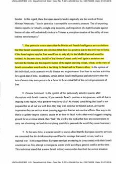 “İngiliz ve Fransız istihbarat servisleri İsrailli meslektaşlarının Suriye'deki iç savaşın olumlu bir tarafı olduğuna inandıklarını belirtiyor; Esad rejiminin devrilmesi halinde İran Ortadoğu'daki tek müttefikini kaybedecek ve izole olacaktır. Aynı zamanda Esad Hanedanı'nın düşmesi, Şiiler ile bölgede çoğunlukta olan Sünniler arasında İran'ın da dahil olduğu bir mezhep savaşını ateşleyebilir ki İsrailli komutanlara göre bu İsrail ve Batılı müttefikleri için hiç de kötü bir şey olmayacaktır.”