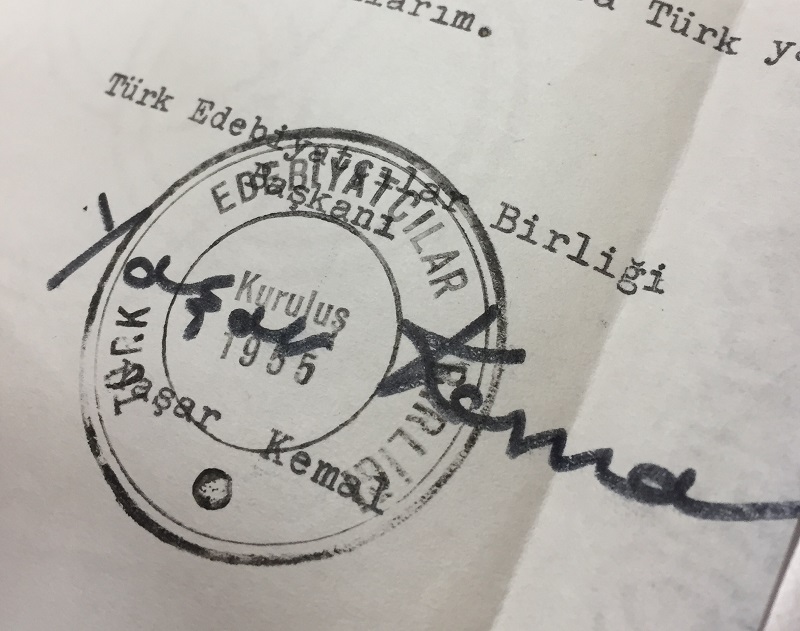 Yaşar Kemal’in mektuptaki ıslak imzası ve Türk Edebiyatçılar Birliği damgası.